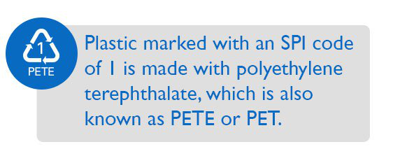 Tworzywo sztuczne oznaczone kodem SPI 1 jest wykonane z politereftalanu etylenu, który jest również znany jako PETE lub PET. Pojemniki na bazie PETE czasami pochłaniają zapachy i smaki z żywności i napojów, które są w nich przechowywane. Przedmioty wykonane z tego tworzywa sztucznego są często poddawane recyklingowi. Plastik PETE służy do wykonywania wielu typowych artykułów gospodarstwa domowego, takich jak butelki na napoje, słoiki z lekarstwami, słoiki z masłem orzechowym, grzebienie, torebki z fasolą i liny. Recykling PETE służy do produkcji torebek , dywanów, materiałów włóknistych w odzieży zimowej i innych.