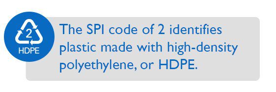 Kod SPI 2 identyfikuje tworzywo sztuczne wykonane z polietylenu o wysokiej gęstości lub HDPE. Produkty HDPE są bardzo bezpieczne i nie są znane z wymywania jakichkolwiek substancji chemicznych do żywności lub napojów (jednak ze względu na ryzyko zanieczyszczenia z uprzednio przechowywanych substancji należy pamiętać, że NIGDY nie należy bezpiecznie używać butelki HDPE jako pojemnika na żywność lub napoje jeśli początkowo nie zawierała jedzenia ani napojów!) Produkty HDPE są zwykle poddawane recyklingowi. Przedmioty wykonane z tego tworzywa sztucznego obejmują pojemniki na mleko, olej silnikowy, szampony i odżywki, butelki z mydłem, detergenty i wybielacze. Wiele spersonalizowanych zabawek jest również wykonanych z tego tworzywa sztucznego. Przetworzony HDPE służy do produkcji plastikowych skrzyń, tarcicy z tworzyw sztucznych, ogrodzeń i innych.