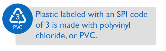 Plastik oznaczony kodem SPI 3 jest wykonany z polichlorku winylu lub PVC. PVC nie jest często poddawane recyklingowi i może być szkodliwe w przypadku połknięcia. PVC jest stosowany do wszystkich rodzajów rur i płytek, ale najczęściej jest stosowany w rurach instalacyjnych. Tego rodzaju plastik nie powinien stykać się z produktami spożywczymi. PVC z recyklingu służy do wykonywania podłóg, listew przyściennych i innych przedmiotów przemysłowych.