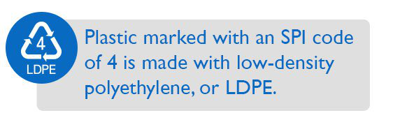 Tworzywo sztuczne oznaczone kodem SPI 4 jest wykonane z polietylenu o małej gęstości lub LDPE. LDPE nie jest zwykle poddawany recyklingowi, ale nadaje się do recyklingu w niektórych obszarach. Zwykle jest trwały i elastyczny. Nie wiadomo też, czy szkodliwe chemikalia są uwalniane do przedmiotów będących w kontakcie z nim, co czyni go bezpiecznym wyborem do przechowywania żywności. Plastikowe okłady, torby na kanapki, wyciskane butelki i plastikowe torby spożywcze są wykonane z LDPE. Recykling LDPE służy do produkcji worków na śmieci, drewna, mebli i wielu innych produktów widzianych w domu i wokół niego.