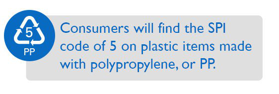 Konsumenci znajdą kod SPI 5 na plastikowych elementach wykonanych z polipropylenu lub PP. PP można poddać recyklingowi, ale nie jest on dopuszczany do recyklingu tak powszechnie, jak PETE lub HDPE. Ten rodzaj plastiku jest mocny i zwykle wytrzymuje wyższe temperatury. Wśród wielu innych produktów jest używany do produkcji plastikowych pieluch, tupperware, pojemników na margaryny, pudełek na jogurt, butelek na syrop, butelek na receptę i niektórych kubków stadionowych . Plastikowe zakrętki do butelek często są również wykonane z PP. Recycled PP służy do wytwarzania skrobaczek do lodu, grabi, kabli akumulatorowych i podobnych przedmiotów, które muszą być trwałe.