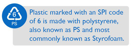 Tworzywo sztuczne oznaczone kodem SPI 6 jest wykonane z polistyrenu, znanego również jako PS i najczęściej znanego jako pianka. PS można poddać recyklingowi, ale nie w sposób wydajny; recykling wymaga dużo energii, co oznacza, że niewiele miejsc to akceptuje. Jednorazowe kubki do kawy , plastikowe pudełka na żywność, plastikowe sztućce, pianki do pakowania i orzeszki do pakowania wykonane są z PS. Recycled PS jest używany do wytwarzania wielu różnych rodzajów produktów, w tym izolacji, ramek tablicy rejestracyjnej i linijek.